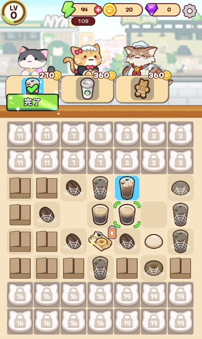 「マージニャンカフェ」は猫カフェを経営しながら、マージパズルを解いていくゲームです。