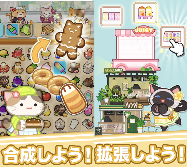マージパズル×カフェ運営ゲームです。