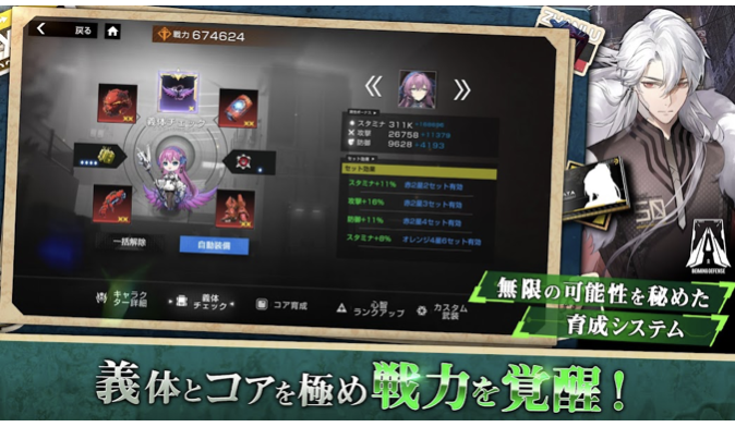 「終境シンフォニー」ではアイテムを集めて仲間を強化していきます。強化のメインになる「コア」を集めて合成し、キャラクター「義体」にセットすることでキャラクターの潜在能力が解放していきます。
