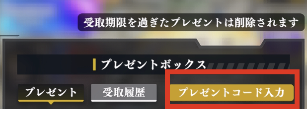 ②「プレゼントボックス」→「プレゼントコード入力」をタップ