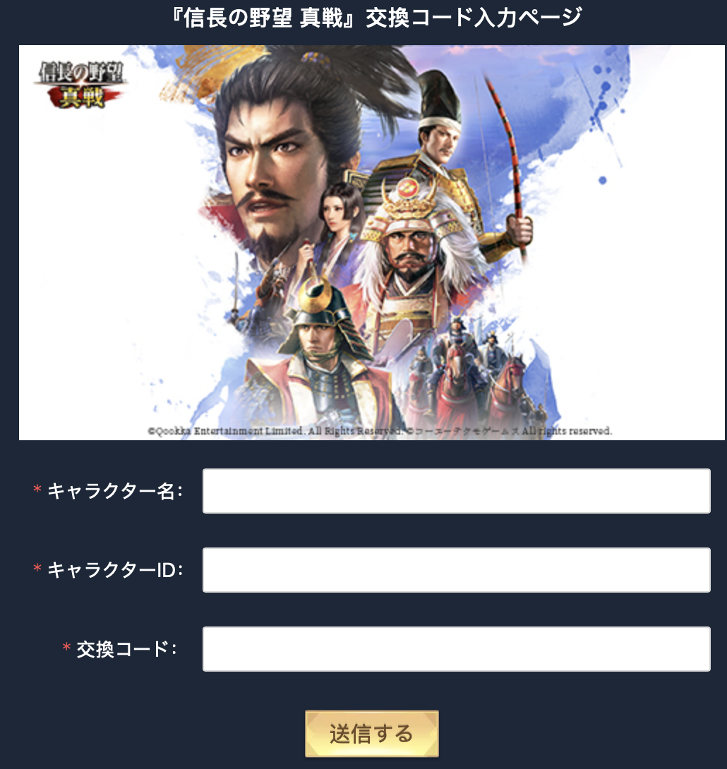 「信長の野望 真戦」の交換コード(ギフトコード)はゲーム外のサイトから入力します。